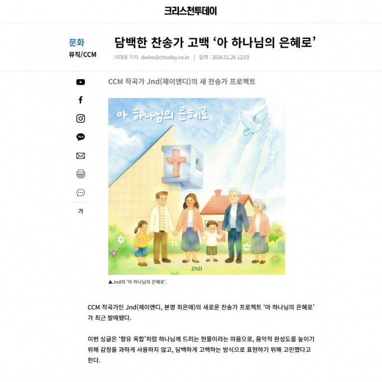 CCM 작곡가인 Jnd(제이앤디, 본명 최은애)의 새로운 찬송가 프로젝트 ‘아 하나님의 은혜로’가 최근 발매됐다.