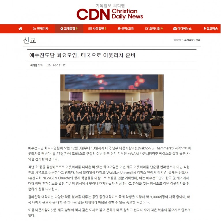 뮤직타임 [기사] 예수전도단 화요모임, 태국으로 아웃리치 준비(기독일보 씨디엔)